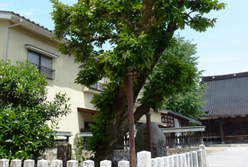 「同じ夜、近くに住むおばあさんもふすま越しに聖人のお話に耳を傾けていました。その話に感動したおばあさん。翌日、出立する聖人を自宅に招き、串柿を差し上げました。その美味をとても喜ばれた聖人は、種を3粒、囲炉裏で半焼きにしていかれました。するとそこから3本の柿の木が育ったのです。そのうちの1本を移植したのが、『御腰掛けの石』の横にある『三本柿』です。」
