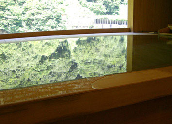 露天風呂が付いている特別なお部屋も見せていただきました。その名も「貴賓室」! この日はお天気も良かったので、窓外に広がる山のみどりも鮮やか。露天風呂のあるベランダに出て、下をのぞくと、翡翠(ひすい)色の黒部川が見えます。(ここは14階・・・。)ちょうど流れがカーブするポイントとなっているので、白い波が立っています。そして、この高さでも響いてくる川の音。思わず深呼吸すると、からだ全体が、すがすがしさで満たされていくようです。蛇口から注がれるのは、もちろん黒薙から引いた温泉。こんなぜいたく、めったに味わえません!