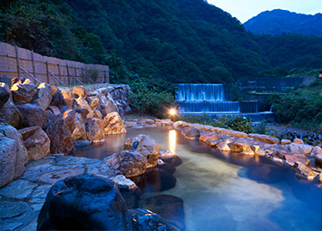 小川温泉では5種類のお風呂を楽しむことができます。内湯にはたっぷりのお湯がこんこんとわき出す大浴場、総ヒノキづくりの巨大な桶の露天風呂、夜のライトアップが美しい露天岩風呂があります。その他に、宿から渓流沿いを歩いて7~8分のところには野天風呂が2つあり、特に天然記念物に指定されている湯の華が固まってできた洞窟風呂は大人気!湯船からの景色は、何も遮るものがなく、実に開放的なのです。他ではなかなか味わうことのできない、小川温泉ならではの野の趣きをぜひ体感してみてください。